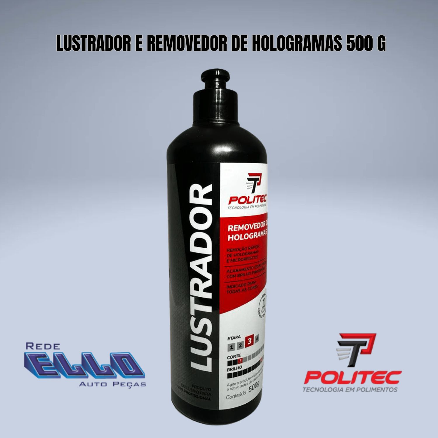 Composto Lustrador Politec , foi elaborado para remoção rápida e permanente de hologramas e defeitos leves provenientes das etapas anteriores do polimento. Sua formulação proporciona acabamento espelhado, livre de riscos e com brilho intenso. Produto isento de contaminantes, podendo ser usado com segurança em repintura automotiva.