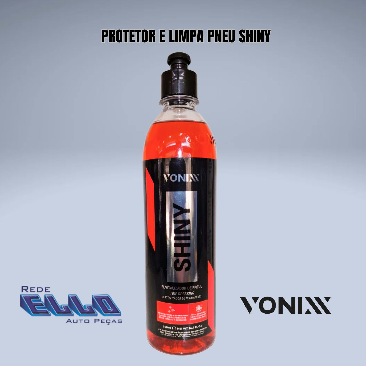 Shiny da Vonixx é um produto desenvolvido exclusivamente para uso em pneus que renova, protege e dá brilho intenso e duradouro aos pneus. O produto não sai ao entrar em contato com a água, podendo alcançar durabilidade de até 60 dias, rende de 15 a 20 aplicações em carros pequenos emantendo o aspecto no pneu de brilho molhado.
